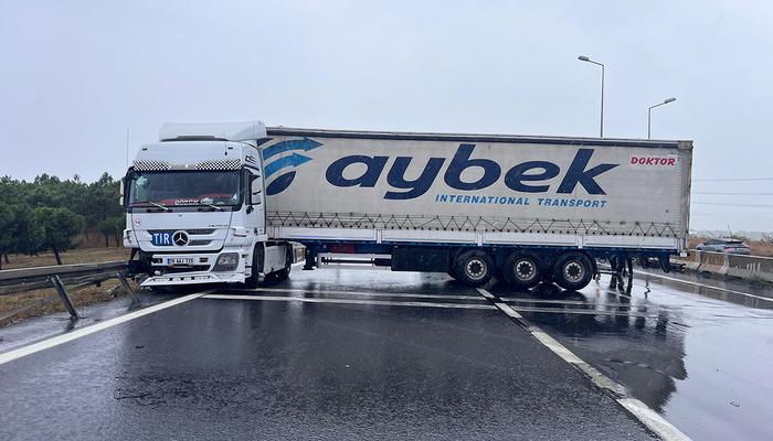 Olay, İstanbul'da öğle saatlerinde Edirne yönüne doğru Büyükçekmece E-5 karayolunda meydana geldi. Yağmur nedeniyle kayganlaşan yolda direksiyon hakimiyetini kaybeden 76 AAJ 725 plakalı kamyon, bariyerlere çarparak yan yana devrildi.
